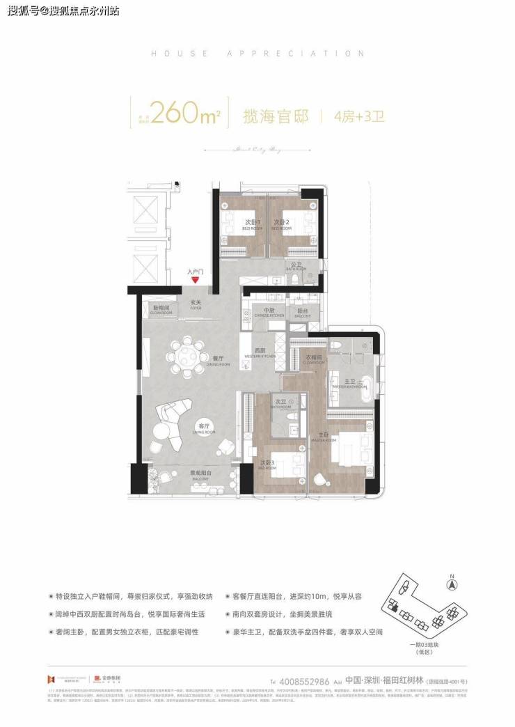 建面约260㎡揽海官邸 4房+3卫(T11-03低区)特设独立入户鞋帽间,尊崇归家仪式,享强劲收纳·阔绰中西双厨配置时尚岛台,悦享国际奢尚生活·奢阔主卧,配置男女独立衣柜,匹配豪宅调性·客餐厅直连阳台,进深约10m,悦享从容·南向双套房设计,坐拥美景胜境·豪华主卫,配备双洗手盆四件套,奢享双人空间