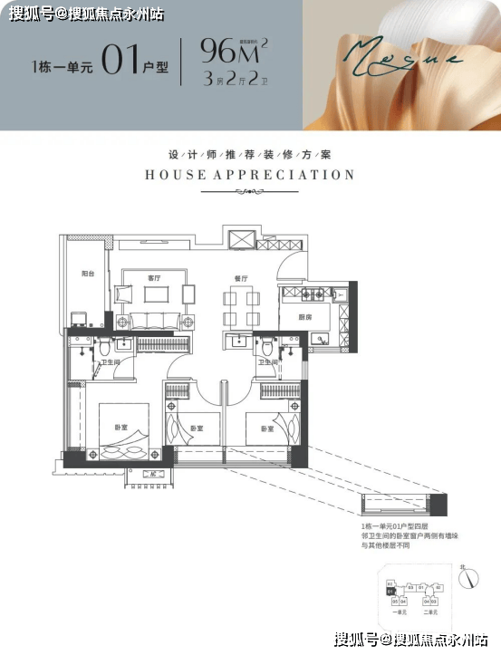 建面96-102平米:3房2厅2卫都是传统的竖厅,动静分区格局。