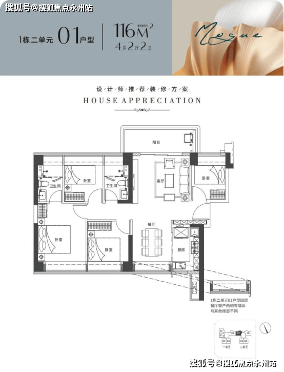 1栋2单元 3T4户,01/02户型116平米4房2卫东北/西南通透户型,03/04户型102平米3房2卫西南朝向。