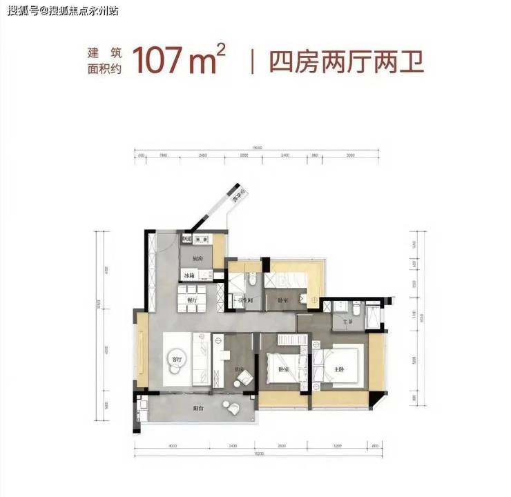 空间布局:动静分区明确,LDKB(客厅、餐厅、厨房、阳台)一体化设计,客厅开间3.3米,连接4.9㎡景观阳台,主卧配备双飘窗及独立卫浴,次卧与书房可灵活调整功能。