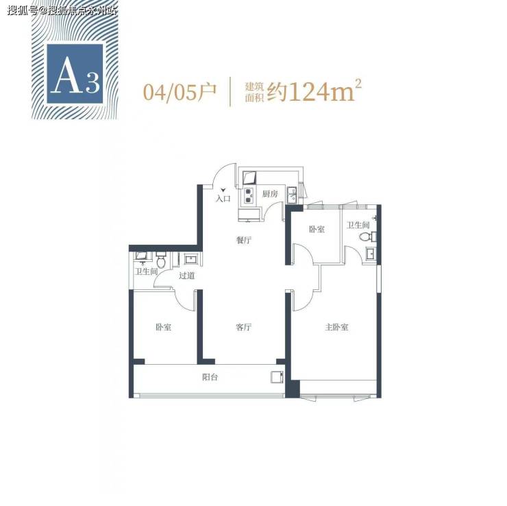 124㎡3房2卫:双龙抱珠的格局,客厅带一个大阳台直接连通次卧,得房率70%左右,均是东南朝向。