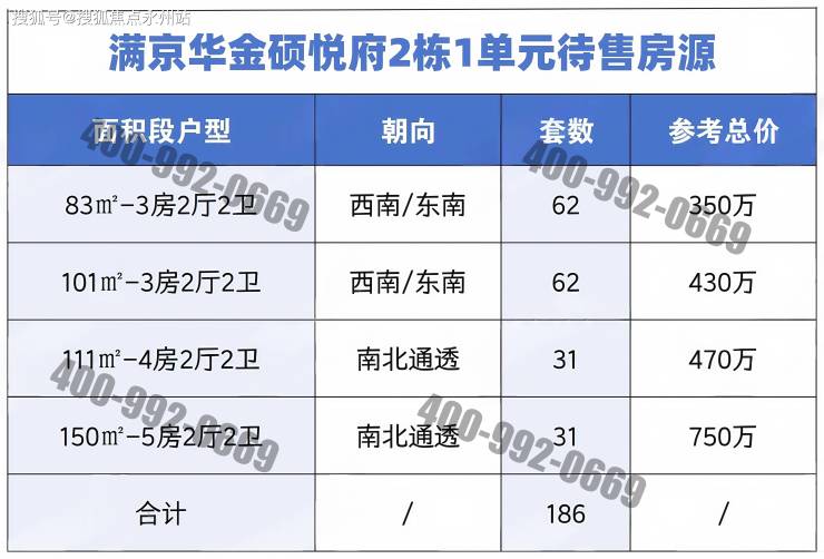 「满京华金硕悦府」 计划将在2025年6月份取证入市,本次计划首推2栋1单元,共186套房源,面积有83-101㎡的3房2卫,111㎡的4房2卫,150㎡的5房2卫户型,价格方面可以参考前期开售的满京华金硕和府,备案均价4.72万/㎡,开盘会有折扣优惠,折后大概4.2-4.3万/㎡,起步门槛预计会在340万左右起,目前样板房暂未开放。