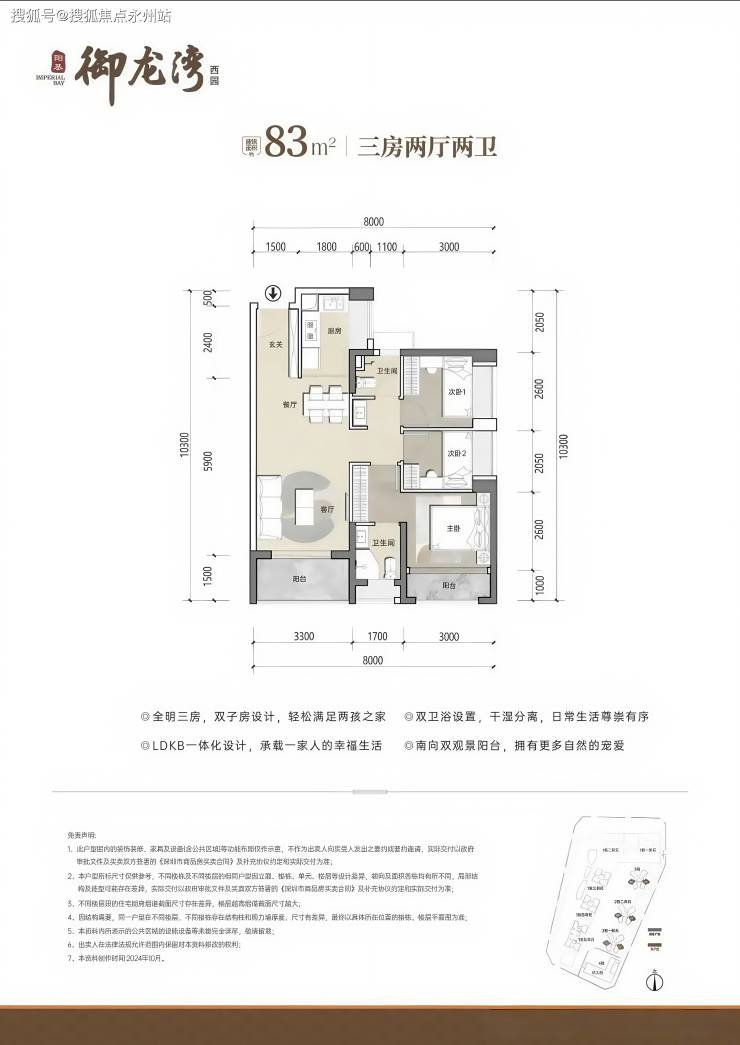 83㎡3房2卫,分布在2栋2单元03/04户型,设计的是竖厅格局,客厅开间3.3米,LDKB一体化设计,三开间朝南,U型厨房,公卫三段式分离设计,得房率约79.25%(不含赠送),东南或西南朝向,加上赠送得房率约89%。