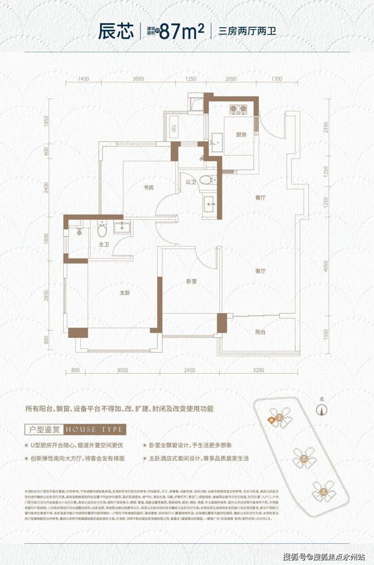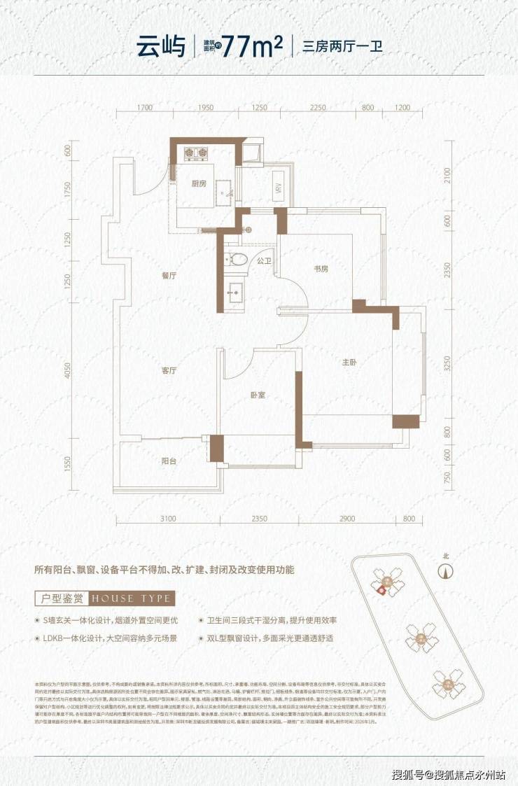 爆款入门:77㎡3房1卫(总价230-260万,3.5万/㎡起)竖厅、三开间朝南、双面飘窗、3米层高、3梯6户。