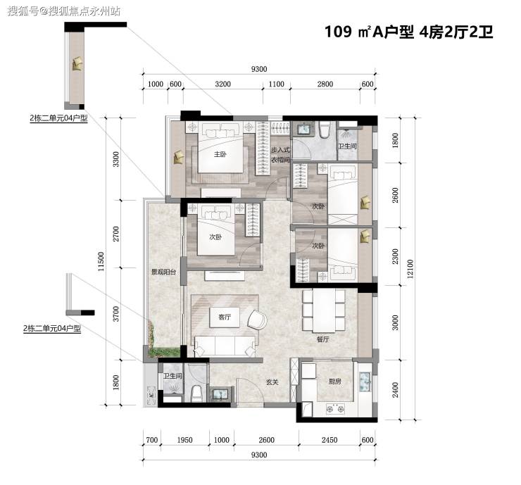 建面约 109 ㎡A户型 4房2厅2卫,总价950万左右,首付约315万