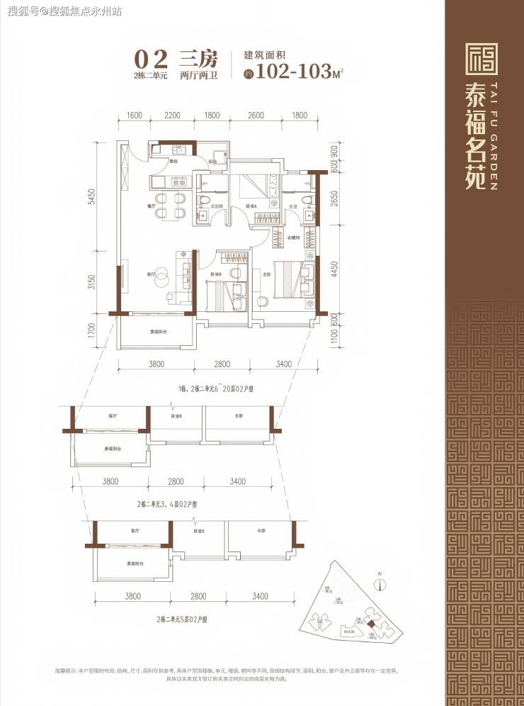 90-102㎡的3房2厅2卫户型。这几个户型都是在主人房多设计一个卫生间,私密性更强,也让家人间的生活更加方便。