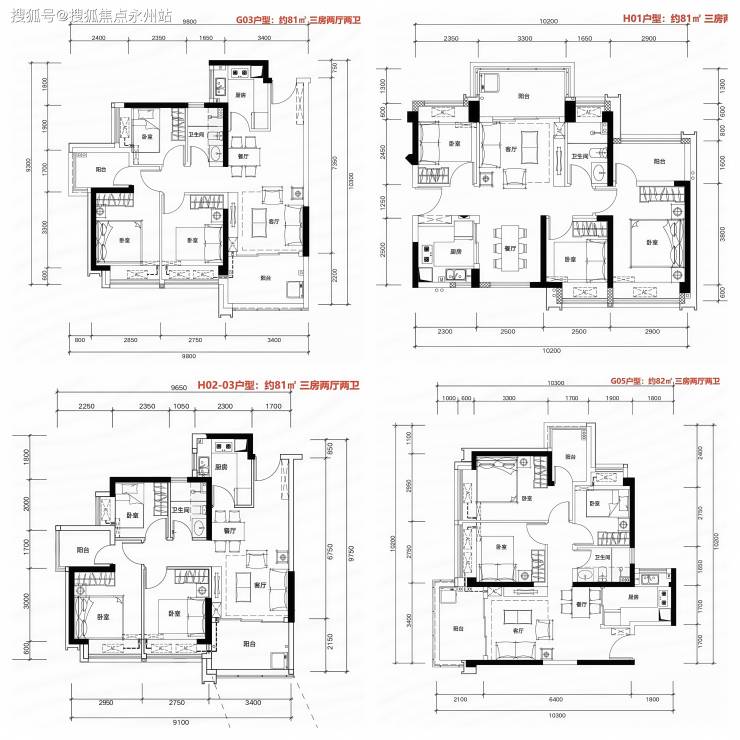 81-82m²3房2厅2卫,有竖厅和南北通户型,客厅开间3.3-3.4米,都有阳台改主卫以及增加客厅进深改造,赠送后得房率在92%左右。