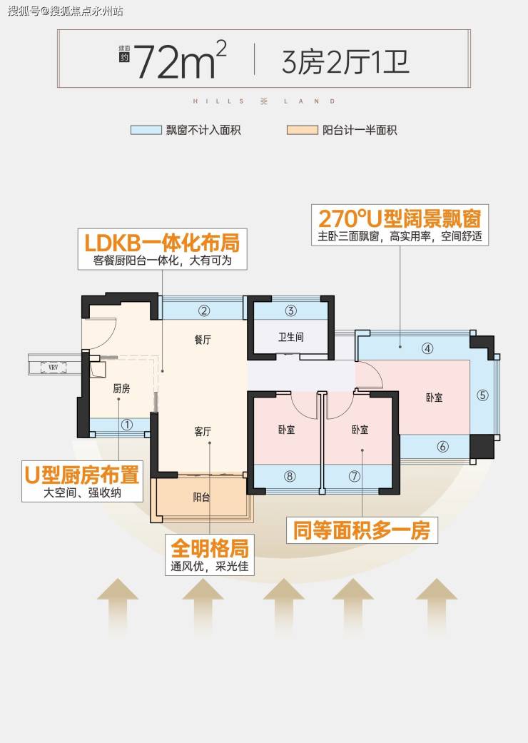 72㎡的3房2厅1卫:东西通透格局,主阳台朝东北,客厅开间3.25米,充分利用了新规对飘窗的加深,大面积的飘窗提升了产品得房率!(分布在1栋1单元和1栋2单元01户型,两条腿)在市面上72平米做三房不多见!