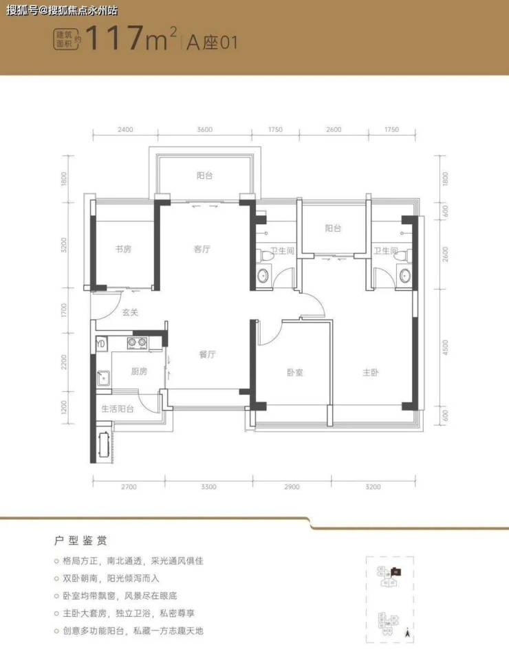 117平四房两卫户型:格局方正,南北通透,采光通风俱佳,双卧朝南,阳光倾泻而入,卧室均带飘窗,风景尽在眼底,主卧大套房,独立卫浴,私密尊享,创意多功能阳台,私藏一方志趣天地。