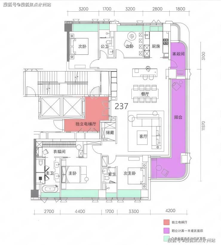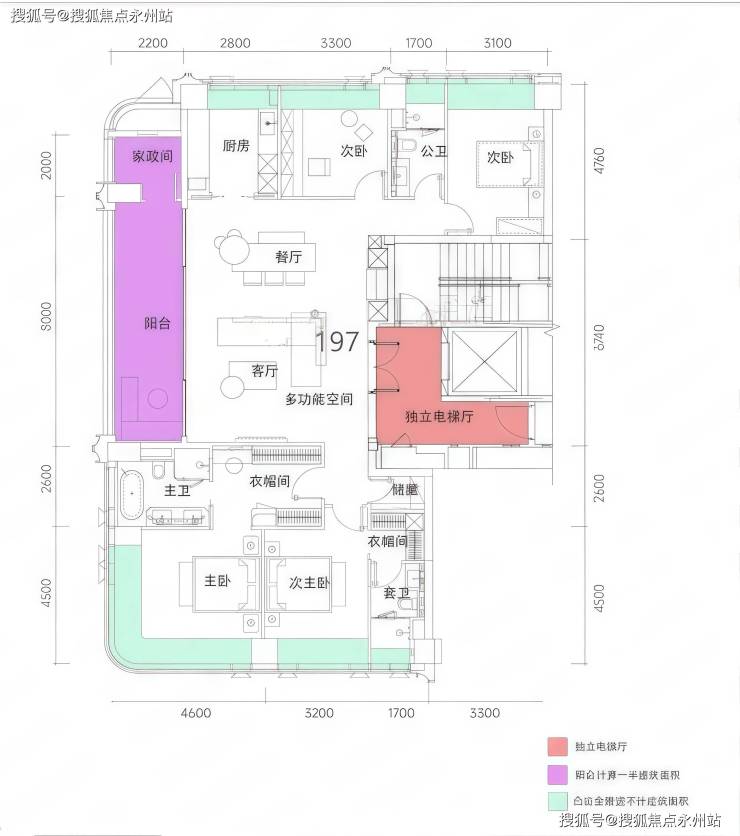 空间效率:常规使用率90%,计入电梯厅后达95%,实际得房率相当于传统户型280㎡。
