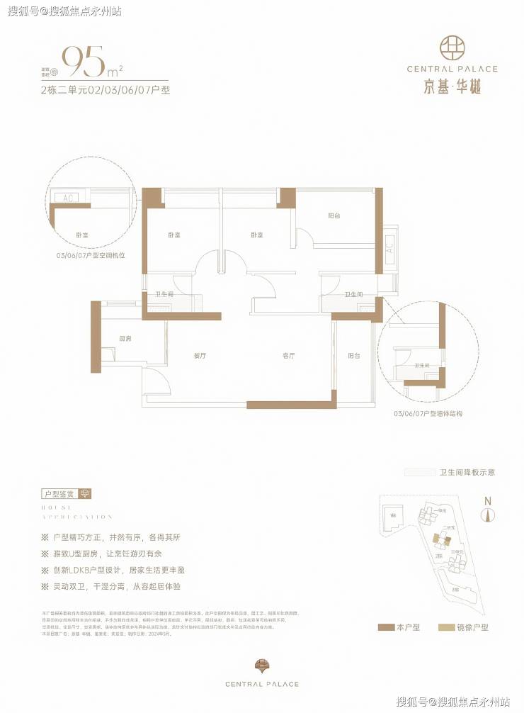 建面约 95㎡ 三房两厅两卫:竖厅格局搭配创新LDKB一体化设计(客厅、餐厅、厨房、阳台联动),L型厨房动线流畅,卫生间干湿分离。得房率约73%(不含赠送),阳台为东南或西北朝向,部分房源可享城市景观。