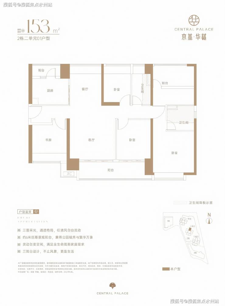 项目主推户型为95-153㎡的三至五房,另有222㎡稀缺大户型,涵盖刚需至高端改善需求。所有户型均采用LDKB一体化设计(客厅、餐厅、厨房、阳台连通),强调动静分区与空间利用率,得房率约73%(不含赠送面积),计入飘窗、阳台等赠送面积后可达85%。