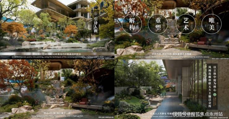 项目园林设计采用岭南风格,灵感源于唐诗锦瑟,命名为"锦瑟栖谷"。约700㎡园林水景占比60%,将山林石泉融为一体,设计有诗境下沉水院、错落楼阁、乌桕树搭配红枫/冬青植被,整体形如聚宝盆,形成四季更迭色彩丰富的视觉盛宴,让每一次归家都像经历一场穿越山林花海的旅行