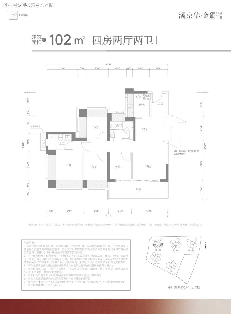 建面约 102㎡明星标杆四房两厅两卫:竖厅格局,四开间朝南,客厅连接 5.9 米超长观景阳台,可扩容生活场景(如打造茶室或绿植区)。主卧套房配备独立卫浴,三间次卧面积均超6.9㎡,满足二孩家庭需求。
