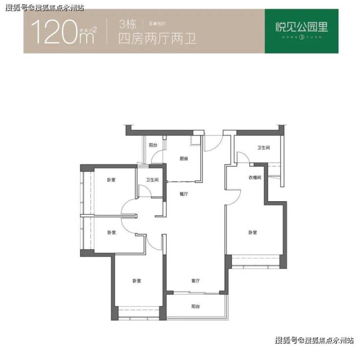 120㎡的4房2厅2卫,仅3栋5单元01户型,设计的是创新式双龙抱珠格局,L型厨房,公卫三段式分离,得房率74.13%(不含赠送),东南朝向。