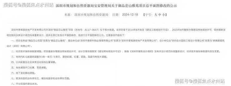 根据深圳市规划和自然资源局于2024年12月发布的公示信息,御品峦山雅苑项目经历了多次规划调整。最初于2014年8月获得《建设工程规划许可证》,后于2020年8月重新办理了建设用地规划许可。目前,项目依据最新的规划指标及设计规范标准进行了重新设计,并对此进行了总平面图的修改公示。