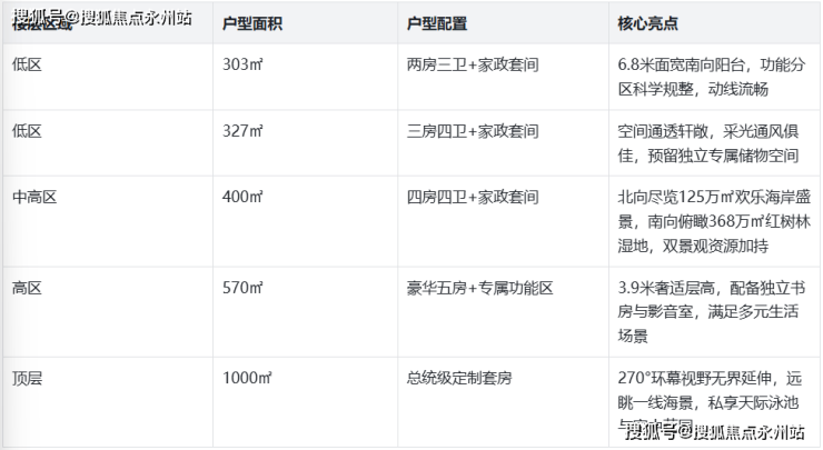 顶级户型:1032㎡超大平层,因270°环幕视野及一线景观优势,单价可达20万/㎡以上,总价突破1.5亿元,定位全球企业主与塔尖收藏者。
