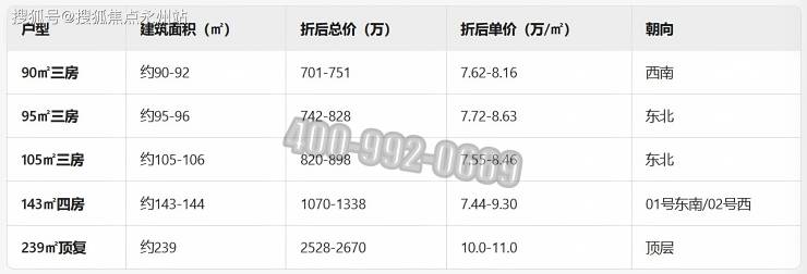 主力户型:90㎡/95㎡/105㎡三房两卫、143㎡四房两卫,另有两套239㎡顶复