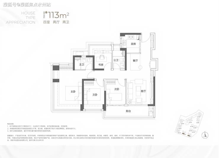 113㎡4房2厅2卫户型:横厅南北通透格局,客餐厅开间6米,LDKB一体化设计,全屋配备飘窗。四个卧室宽度分别为3.9米、3米、2.8米和2.6米,主卧和一个次卧配备270°全景飘窗。客厅设有6米长的大阳台,L型厨房,得房率约95-97%(含赠送),朝向西南或东南。
