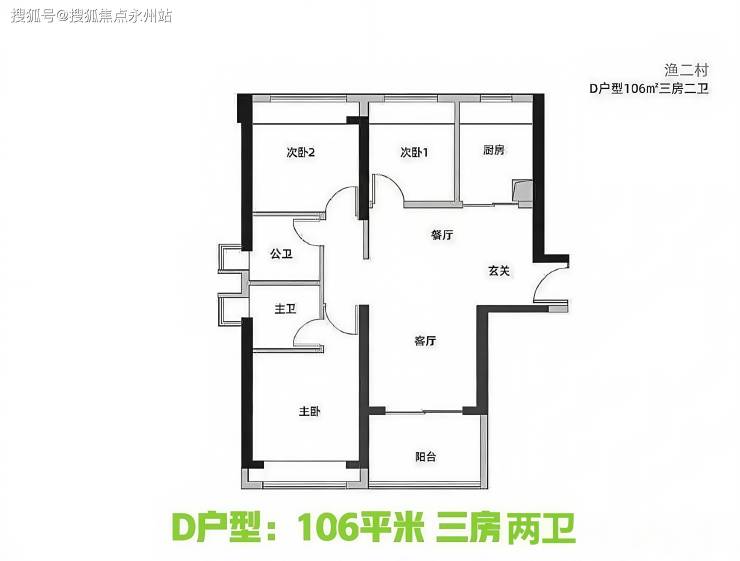D户型106平米 三房两卫:传统竖厅,过道浪费少,阳台比较宽,厨房跟次卧离得太近,可能干扰!
