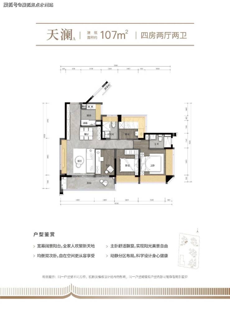 改善优选:107㎡四房的全周期居住解决方案,作为项目的改善型产品,107㎡四房两厅两卫户型瞄准了光明片区成长型家庭的需求,通过合理布局和尺度把控,实现了"一步到位"的居住梦想。该户型采用横厅南北通透格局,6米的客餐厅开间配合6.7米长的南向阳台,营造出媲美更大户型的空间气场,重新定义了区域内四房产品的标准。