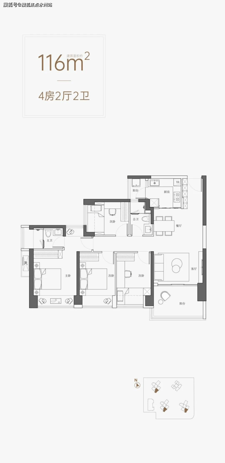 项目总户数是706户,其中可售房源约573套,其它是回迁房,主力户型是建面约97㎡三房两厅两卫、约112-116㎡四房两厅两卫、约135四房两厅两卫,另外还会有少量回迁户选剩下的56㎡两房两厅一卫。
