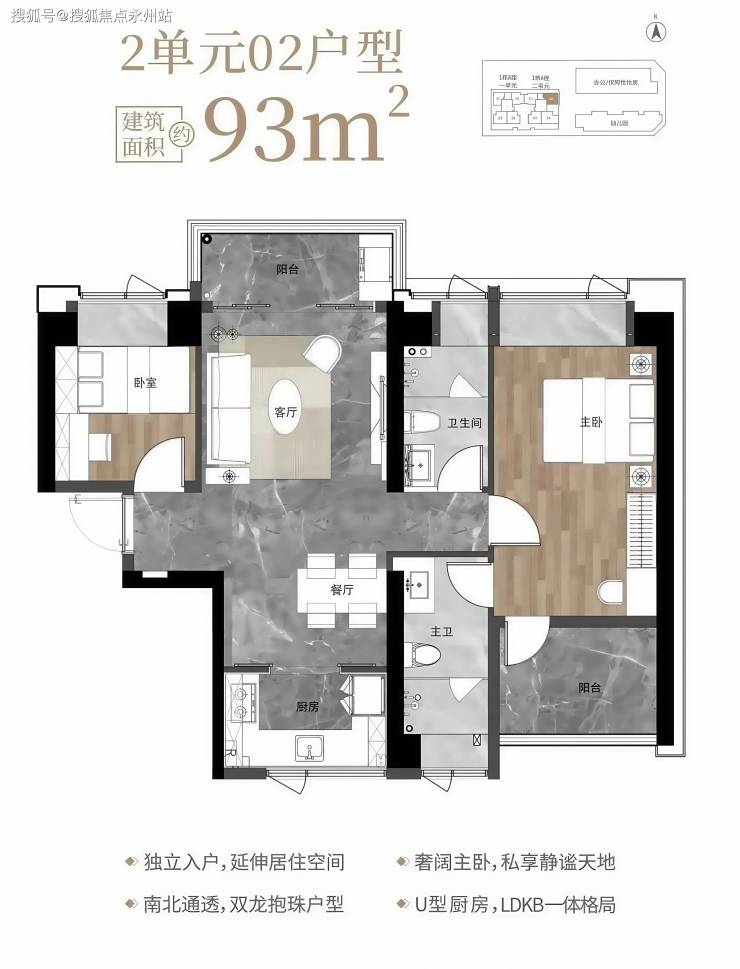 93㎡的3房2厅2卫,1栋2单元02户型,设计的是竖厅南北通透格局,独立入户,客厅3.6米开间,客餐厅分离设计,U型厨房,卫生间干湿分离,阳台正北朝向。