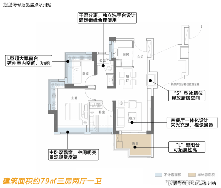 79㎡三房两厅一卫:全南向设计,7个飘窗,L型大阳台(约6.2㎡),三分离卫生间,LDKB一体化布局。