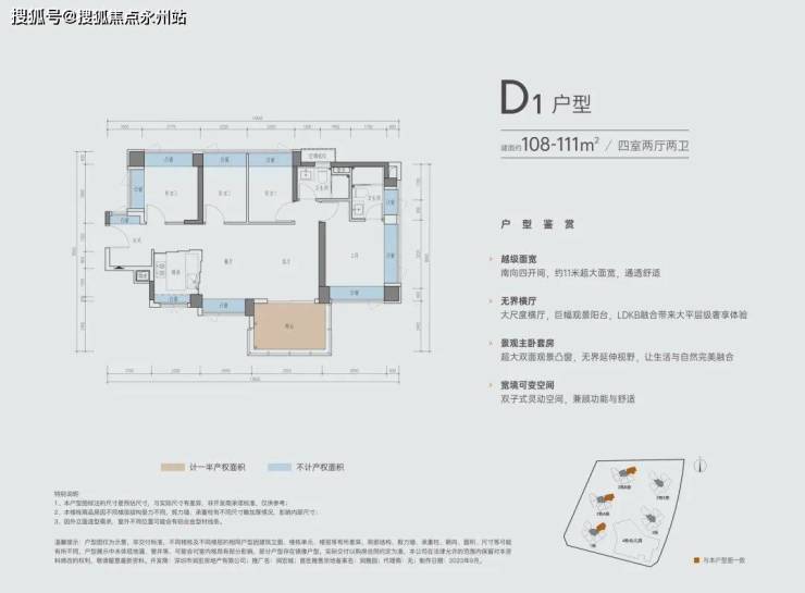 D1户型-108-111㎡-4房2厅2卫,设计的横厅格局,无界横厅LDKB融合,约11米超大宽面,客餐厅5.8米开间,全屋凸窗,双凸窗主卧套房,南北通透。