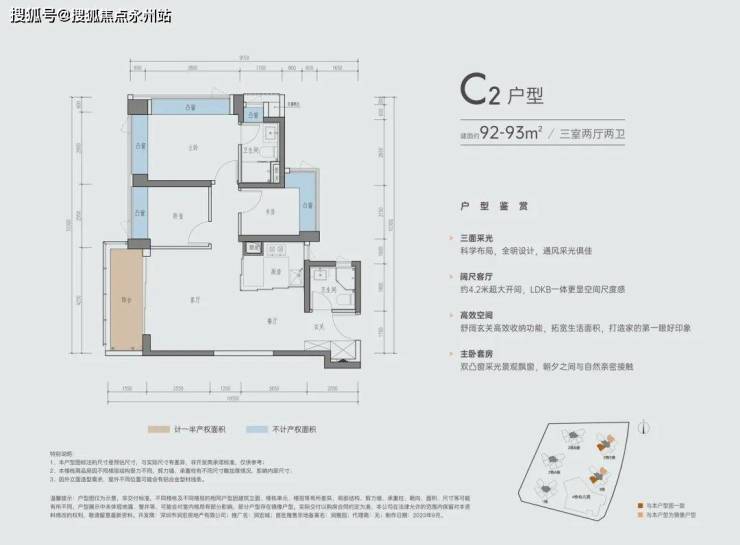 C2户型-92-93㎡-3房2厅2卫,设计的竖厅格局,大气方厅,同面积段难得的LDKB一体化设计,客厅4.25米开间,双凸窗主卧套房,西南及东北朝向。