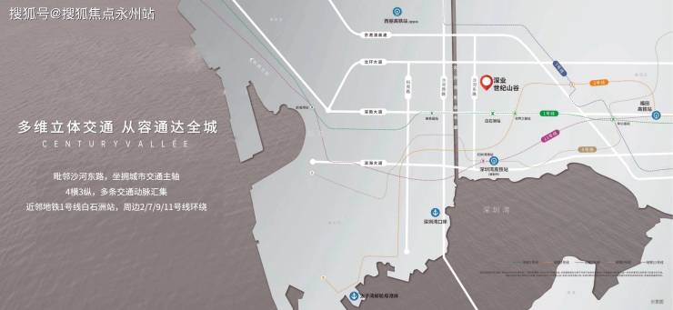 深业世纪山谷家门口有在建设中的29号地铁线“白石洲站”,已经开通的1号地铁线“白石洲站”距离约600米,1站到高新园,3站到红树湾,4站到科苑,5站到后海。另外自驾10分钟内可达深圳湾总部基地,南山高新园,20分钟内可到后海总部基地。(深圳南山深业世纪山谷售楼处电话:400-992-0669)