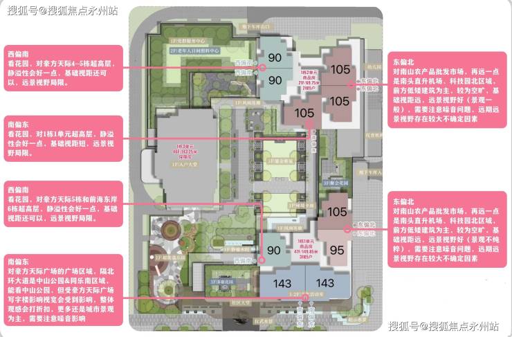 朝向:90㎡户型有三条腿,均为西偏南朝向,95㎡户型只有一条腿,为东偏北朝向,105㎡户型有4条腿,其中3条腿是东偏北朝向,1条腿为南偏东朝向,143㎡户型有2条腿,均为南偏东朝向。