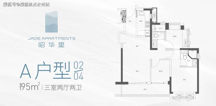 约95㎡三房两卫(1栋02/04户型)竖厅格局,餐客一体,动静分区结构,S型墙预留冰箱位,阳台连接客厅与卧室1,02户型东南朝向,04户型西南朝向。