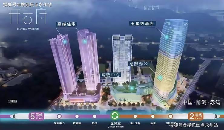 赤湾先发山海都会超体:3.2平方公里赤湾先发·城市双地铁综合体,集高端住宅、购物中心、总部办公、五星级酒店等复合业态于一体,筑就赤湾地标,焕新山海生活。