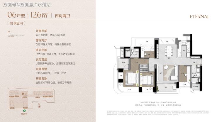 每个户型都有飘窗+设备平台赠送,其中105-126㎡户型有单独的阳台赠送,可改为小书房。