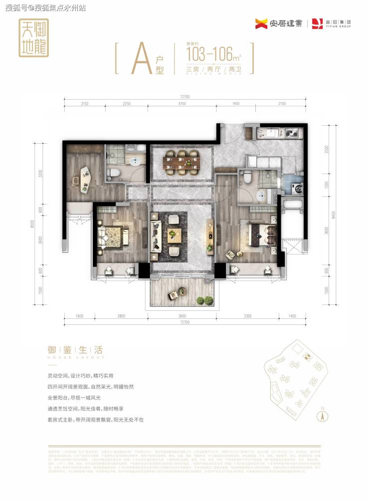 103-106平方米的三房两卫,总价799-951万元,单价7.7-8.9万元/平方米。