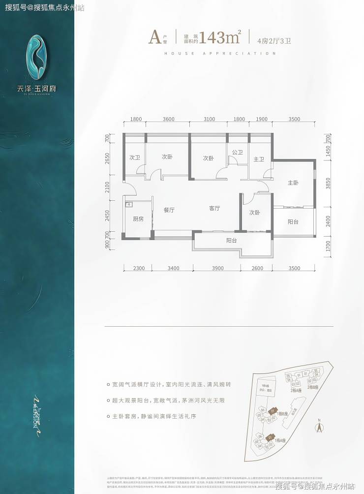 143㎡四房两厅三卫:横厅南北通透格局,客餐厅开间达7.3米,双主卧套房设计,房间宽度2.6-3.6米,超大观景阳台6.5米长,主朝东南向,直面茅洲河景观,得房率91.1%(含赠送)。