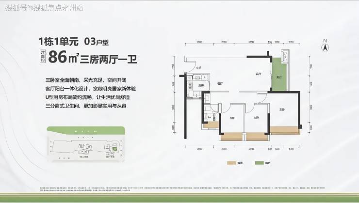86㎡的3房2厅1卫,1栋1单元03户型,设计的是竖厅格局,客厅3.5米开间,LDKB一体化设计,进深9.95米,主卧全朝南,动静分区,U型厨房,卫生间三段式分离,阳台1.5米进深,东南朝向。
