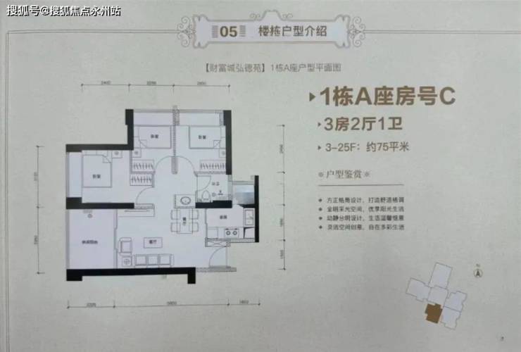 75㎡的3房2厅1卫,设计的是竖厅格局,客厅3.05米开间,3个卧室分别是3.1/2.85/2.25米的宽度,L型厨房,带1个小生活阳台,卫生间三段式分离设计,得房率约:76%(不含赠送),西南及西北朝向。