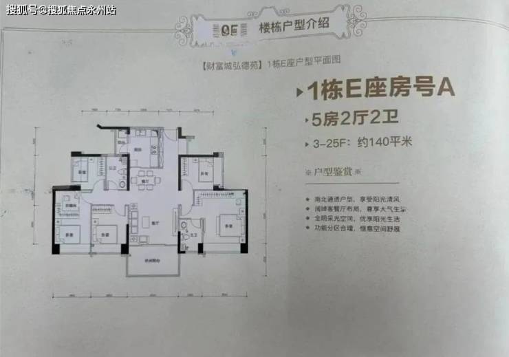 140㎡的5房2厅2卫,设计的是竖厅双龙抱珠格局,客厅4米开间,四开间朝南,4个卧室分别是3.55/2.95/2.95/2.7米的宽度,L型厨房,带1个小生活阳台,得房率约:76%(不含赠送),西南、东南朝向。