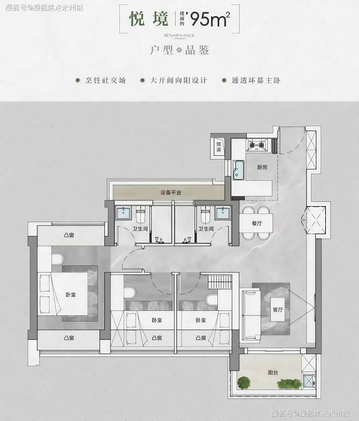 而95平表面看起来3房2卫的户型,使用率含赠送约95.61%,同样是传统竖厅格局,但是赠送的设备平台连接2个卫生间,所以就有网友开始爆改!