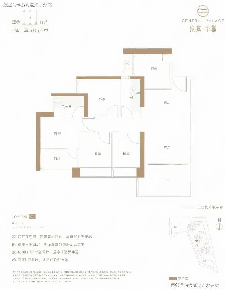 111㎡的3房2厅2卫,仅2栋2单元05户型才有,设计的是经典竖厅格局,LDKB一体化,动静分区,四开间朝南,U型厨房,卫生间干湿分离,得房率约73%(不含赠送),阳台西南朝向。