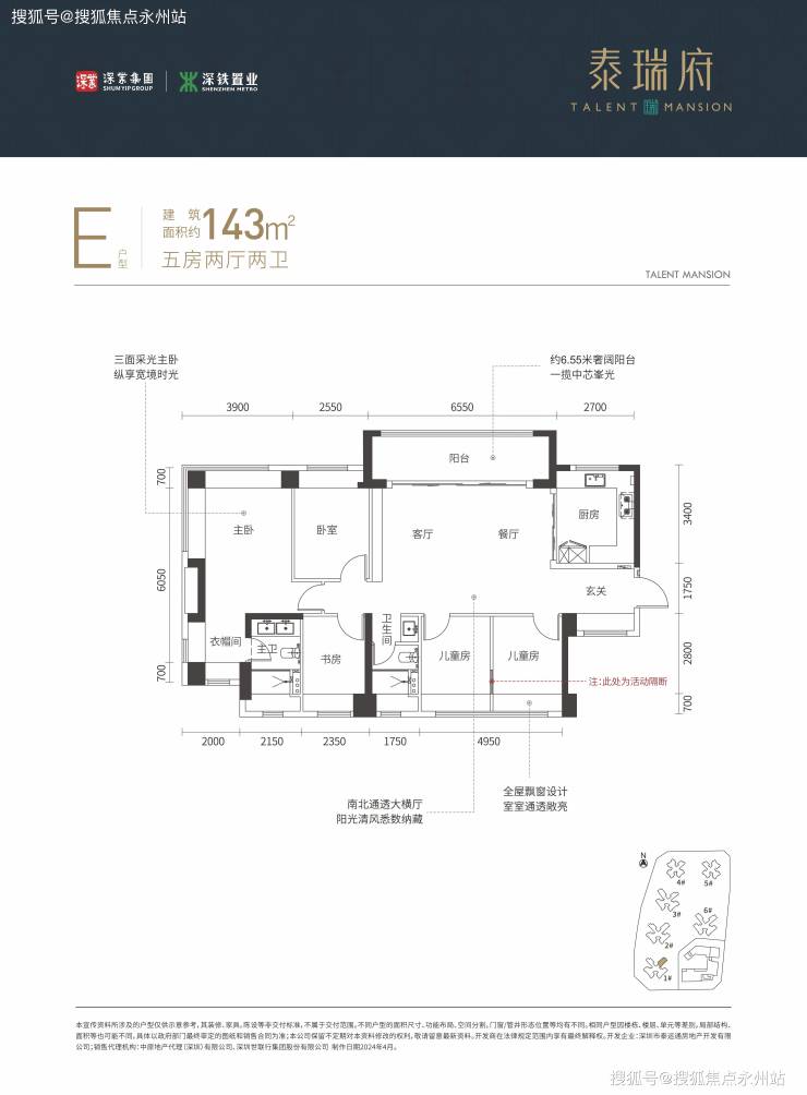 建面约 143㎡ 5 房 2 厅 2 卫:横厅设计,客餐厅开间6.55米,四开间朝南,五间卧室尺寸分别为3.9米、2.55米、2.48米、2.47米、2.35米,U型厨房搭配三段式分离公卫,得房率约77.48%,阳台主朝东南或西南。