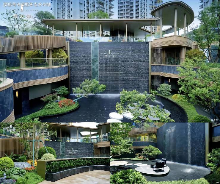 此外,巧妙地打造了近9米的水庭院瀑布,其形制和规模在前海乃至整个深圳的园林景观中都是极为罕见的。这处水庭院的整体设计构思独具匠心,利用建筑所围合的立体空间,营造出一幅“藏于建筑之中的垂直山水诗画”的美丽画卷。