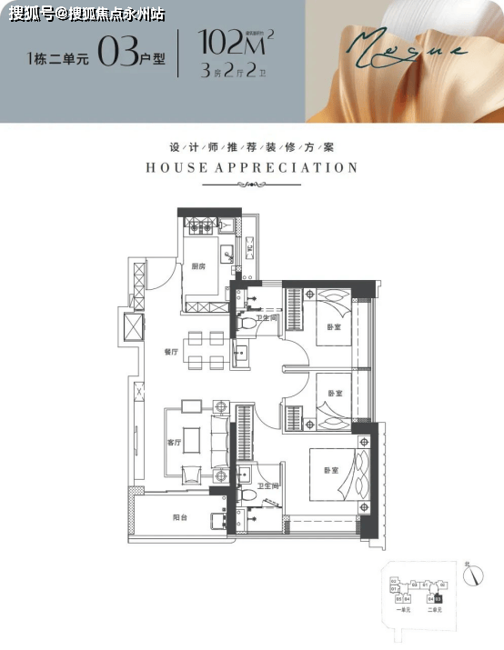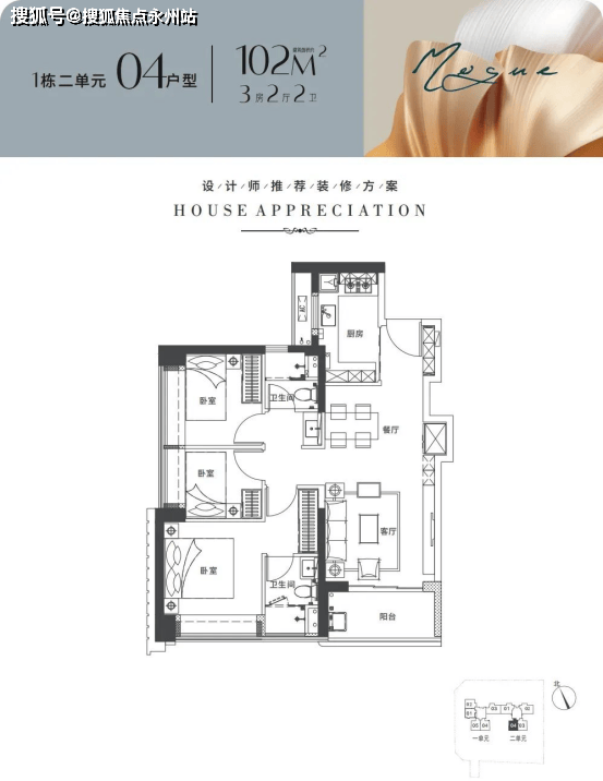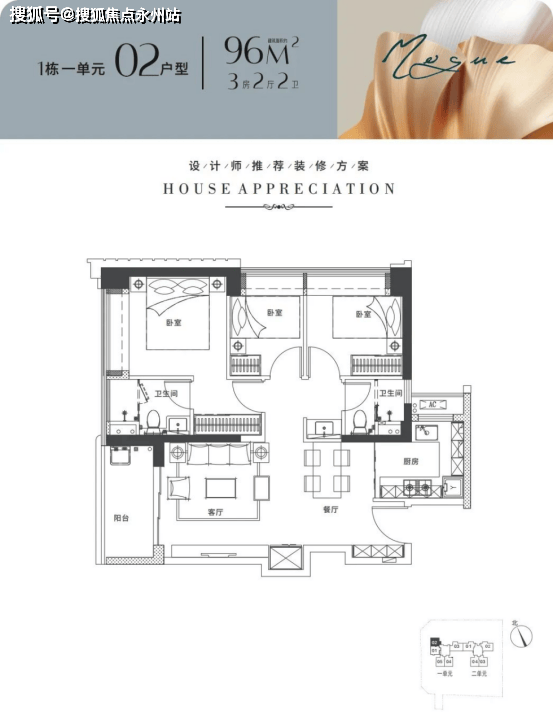 建面96-102平米:3房2厅2卫都是传统的竖厅,动静分区格局。