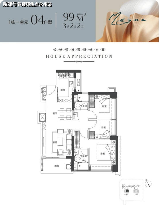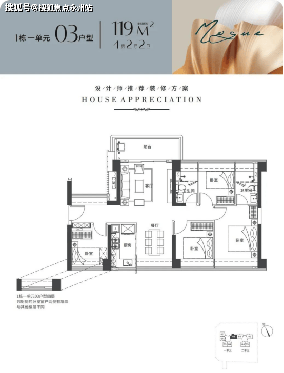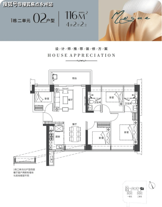 1栋2单元 3T4户,01/02户型116平米4房2卫东北/西南通透户型,03/04户型102平米3房2卫西南朝向。