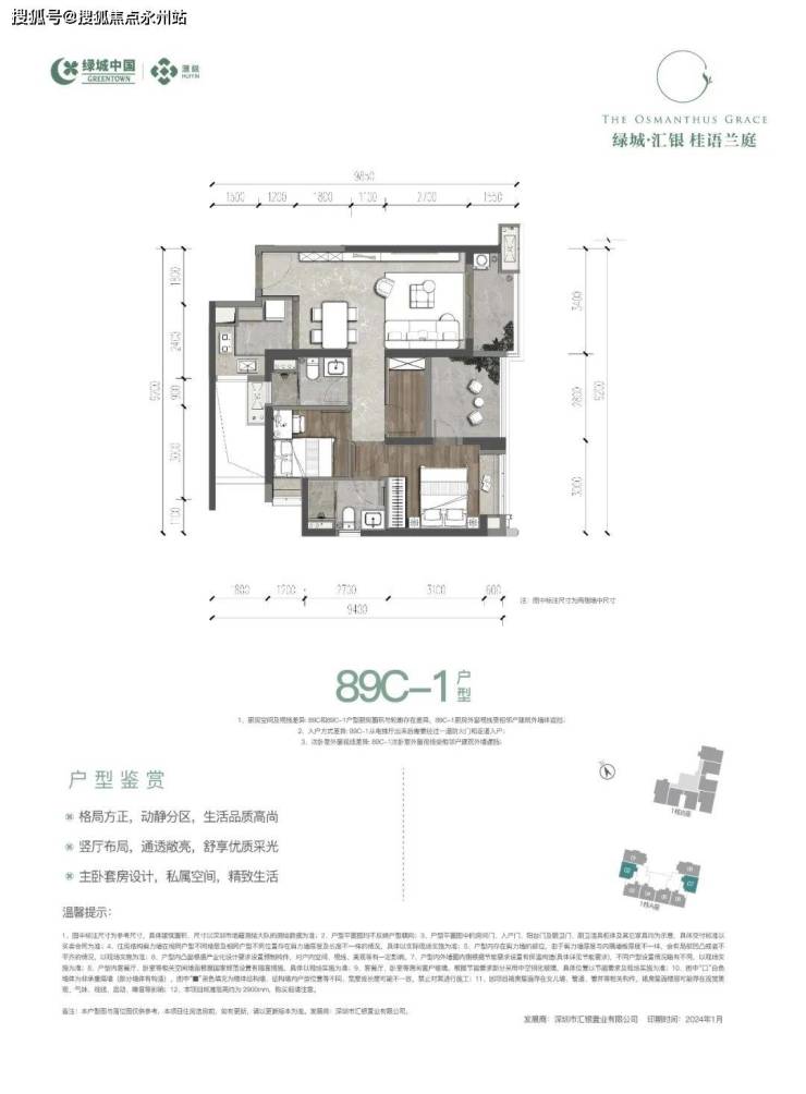 89㎡的3房2厅2卫(C户型),设计的是经典竖厅格局,餐客厅一体化,客厅3.4米开间,三开间朝南,3个卧室分别是3米/2.8米/2.4米的宽度,U型厨房,阳台1.5米进深,西南朝向。