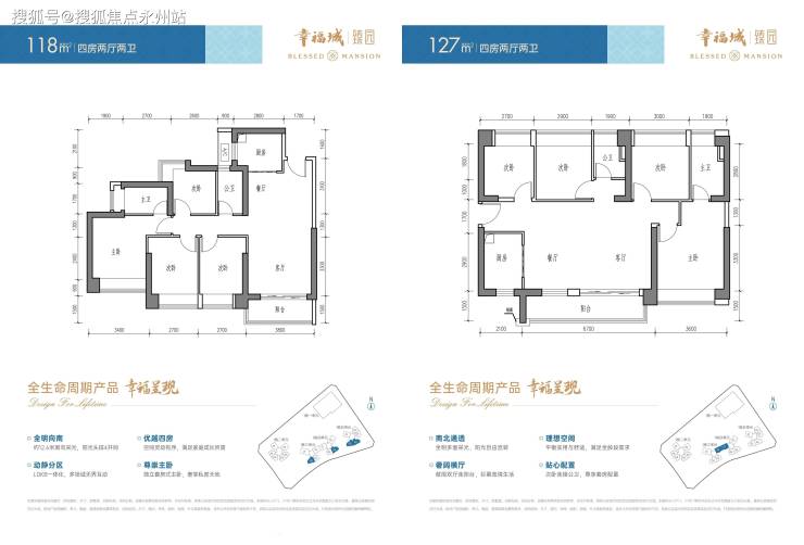 114-127㎡4房2卫:横厅南北通透格局,客餐厅开间6.3-6.7米,全屋配置飘窗,得房率约84.87-87.72%。