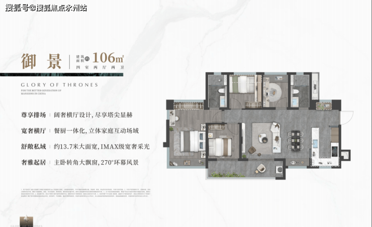 106㎡的4房2厅2卫,设计的横厅户型,餐厨一体化,约13.7米超幕视野,超长阳台,主卧转角270°大飘窗,只有1条腿,阳台主朝西南向,通透格局。