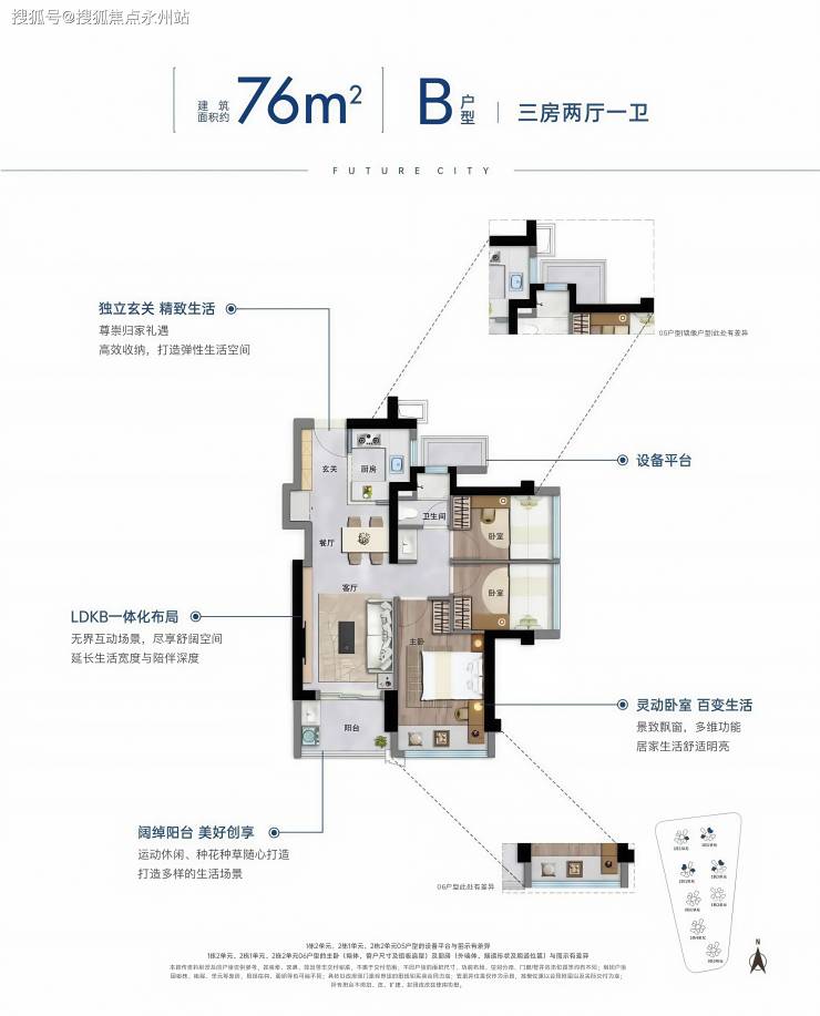 建面76㎡:3房1卫,和其他地方卓越产品相比,该户型有很大的改进,特别是承重墙,飘窗利用非常方便;主要面向宝安/沙井300万左右的刚需购房者。